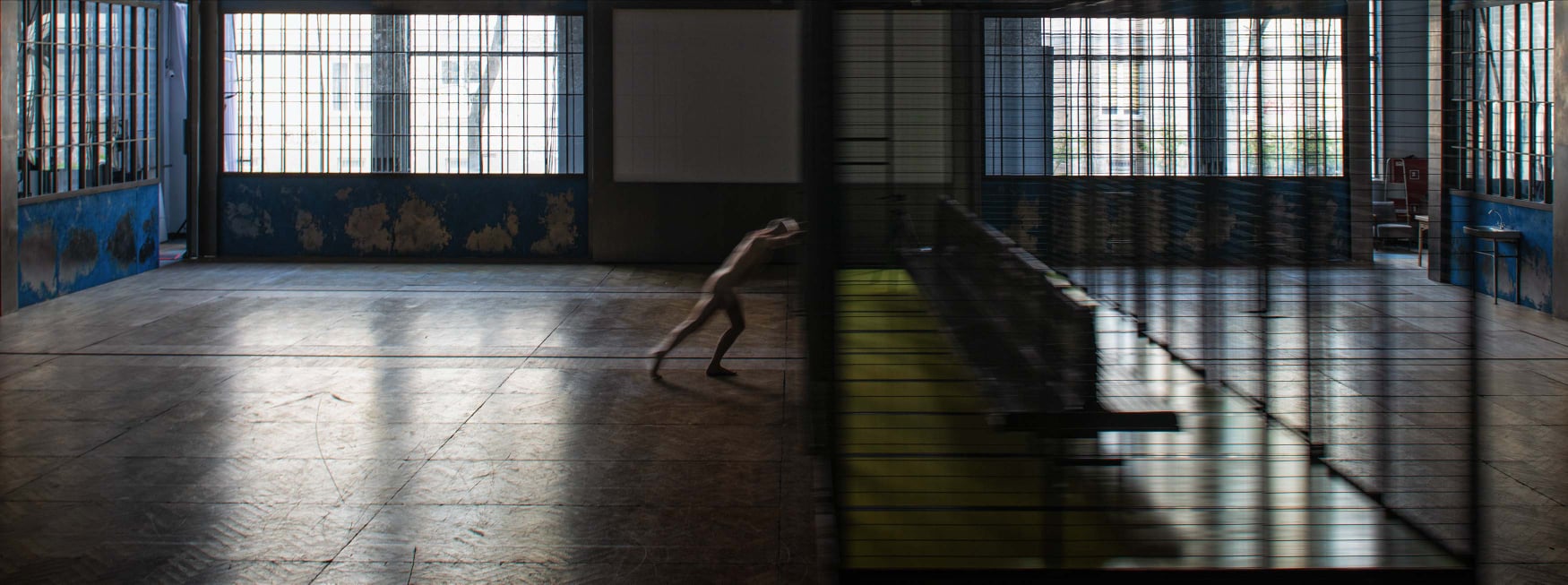 Elementem scenografii, który bez wątpienia przykuwa uwagę jest zegar. To on do końca spektaklu będzie odmierzał czas. Nasz czas. Bywa denerwujący i irytujący jednocześnie, bo jednak zdarza się na niego popatrzeć. Przecież przyszliśmy do teatru na chwilę wytchnienia od czasu i przestrzeni, od tego co zwykliśmy nazywać codziennością. Ale Warlikowski nie pozwala nam o nim zapomnieć. Nie pozwala również na dobre odciąć się od tego co jest poza murami teatru, poza sceną, zostawiając odsłonięte okna. Widzimy to, co dzieje się za nimi, tych przechodniów którym zdarza się popatrzeć na nas-widzów i na aktorów. Jesteśmy tu i teraz chociaż zewsząd będzie oplatać nas przeszłość. Przenikać każdy możliwy zakamarek, przypominać o sobie bezlitośnie. Mamy jeszcze duży podest otoczony z każdej strony żelaznymi kratami, który w zależności od bohaterów pełnić będzie ważną dla nich funkcję. Jest sklepem odzieżowym Izoldy Regensberg i jej męża, czy więzieniem do którego trafia kobieta w czasie wojny. Ale jeśli połączymy to miejsce z innymi wątkami ze spektaklu nie trudno doszukać się w nim powiązań z obozami koncentracyjnymi. Może to być miejsce, za którego drzwiami jest komora gazowa, a wierzący więźniowie zostawiali w nim ubrania myśląc że idą tylko na kąpiel. Może to być to miejsce gdzie więźniów obozów pozbawiano wszystkiego, tatuując, ubierając w pasiaki i goląc głowy, czyniąc z nich już tylko numerki, niszcząc człowieczeństwo. Mamy jeszcze dwie przeciwległe ściany scenografii przywołujące na myśl zakład fryzjerski i salę gimnastyczną. Reszta to już tylko pusta przestrzeń, którą bohaterowie wypełnią swoimi historiami. Małgorzata Szczęśniak, autorka scenografii, stworzyła przestrzeń otwartą na to co przynoszą postacie, dopasowującą się do każdej z opowiadanych przez nich historii, a przy tym ponurą i zimną. Przytłaczającą. Nie pozwalającą widzom poczuć się w niej bezpiecznie, dać tej oczekiwanej strefy komfortu.